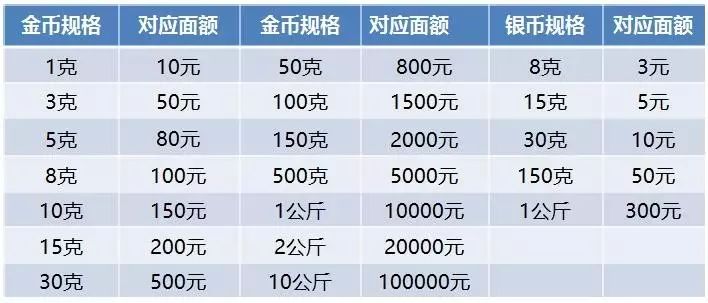 中国人民银行自2000年发行 “千年纪念”金银币开始,规范统一了贵金属纪念币各种材质的规格品种与其标注面额的标准。具体见下表:(如有增加会及时补充)