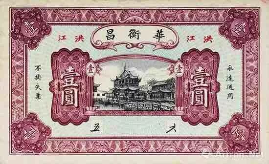 位于湖南省怀化市西南部的洪江,为华夏杂交水稻之发源地。民国年间,此地的华衡昌钱庄曾发行过壹圆光洋券(图6),其正面即带有上海豫园湖心亭的图景。此券纵9.6、横15.7厘米,由湖北省汉口石印公司印制。