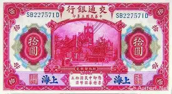 民国三年(1914),始建于1908年且总行设在上海,为我国历史最悠久的国有商业银行之一,也是民国四大发钞行之一的交通银行,其发行的拾圆券正面(图2),即印有上海汉口路外滩教堂式关署的图案。