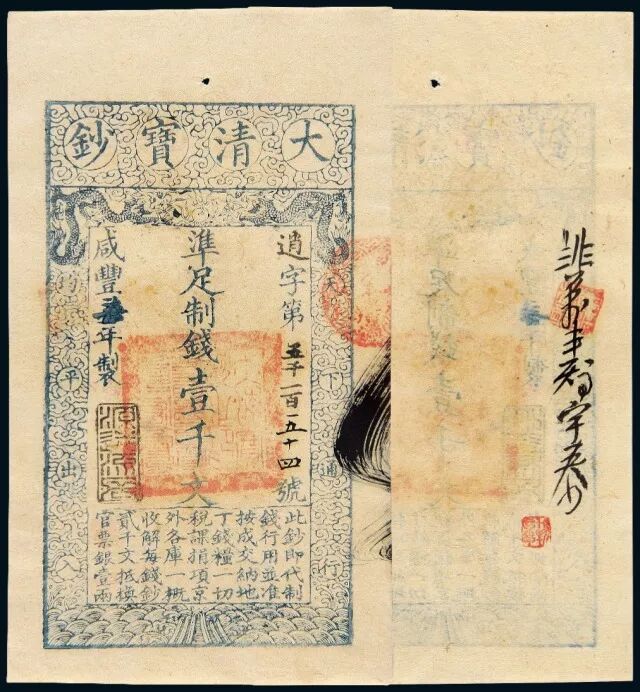 大清宝钞从咸丰三年开始发行到咸丰九年止,七年的时间里持续发行。而自咸丰五年开始增发大钞:伍千文、拾千文、伍拾千文 及 百千文 面额宝钞。