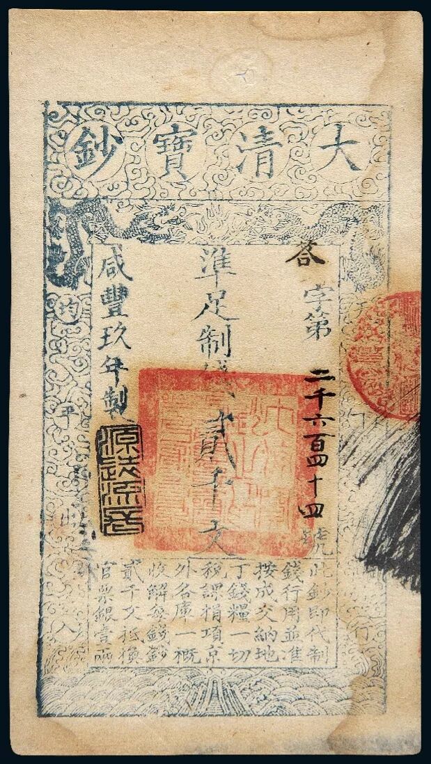 咸丰九年是大清宝钞发行的最后一年,目前仅见有 贰千文、伍千文、拾千文、伍拾千文、百千文,迄今未见伍佰文及壹千文。